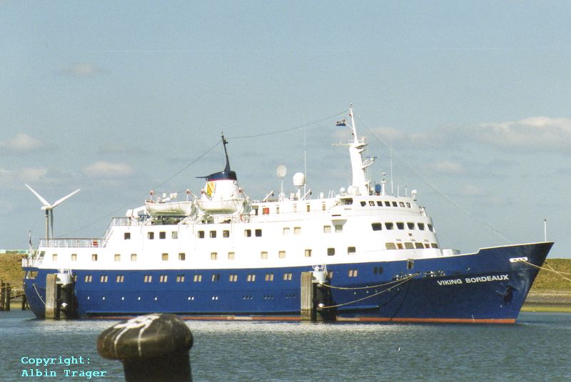 Kreuzfahrtschiff ms VIKING BOURDEAUX am 09.April 2003 in Eemshaven aufliegend. Das Schiff kann 180 Passagiere in 93 Kabinen befördern.