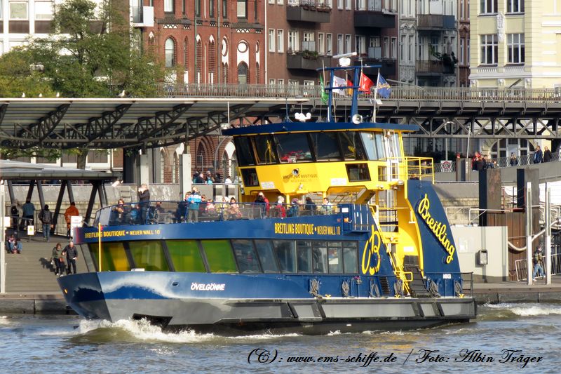 ms ÖVELGÖNNE in der Farbgebung "Breitling Boutique" von den Landungsbrücken ablegend. | ![]() | |