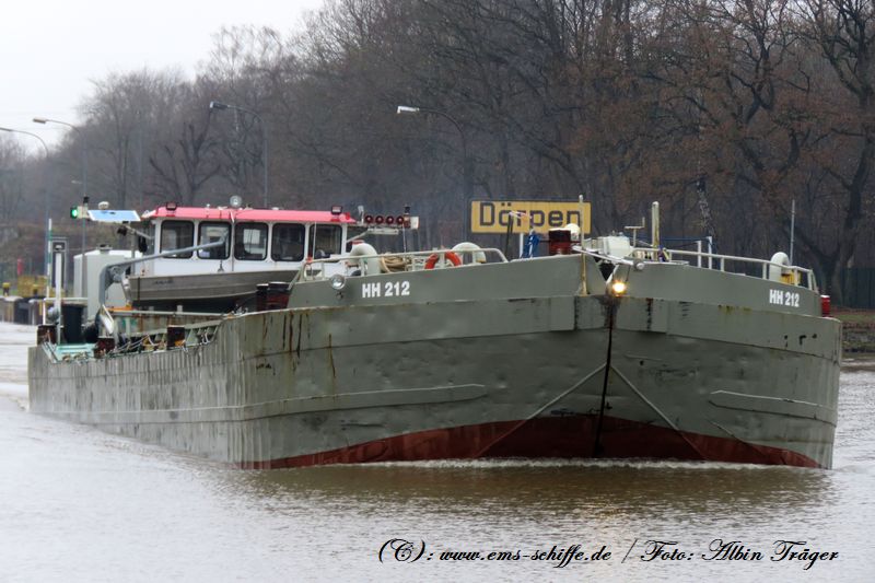 Die Motorklappschute HH 212 passiert die Schleuse Dörpen ostgehend.