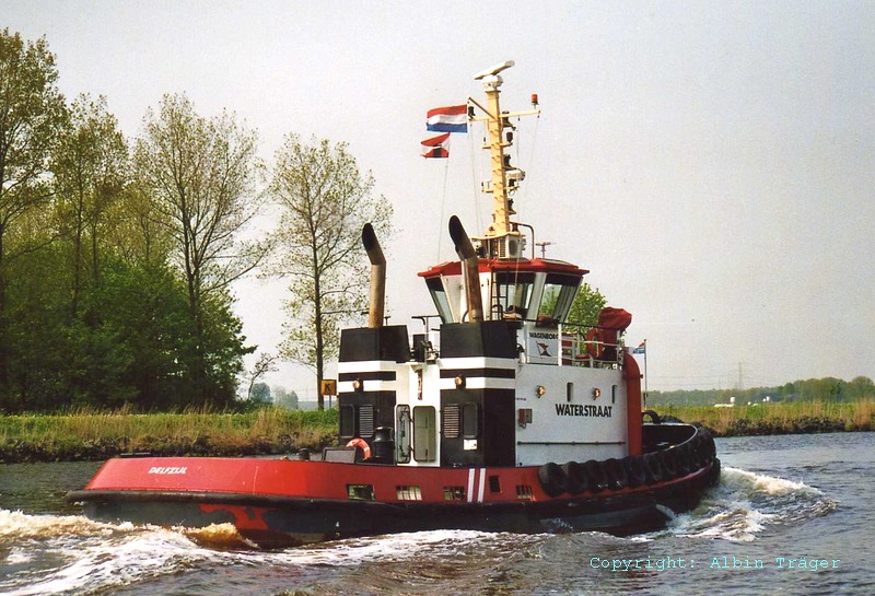 ms WATERSTRAAT des Wagenborg Sleepdienst BV aus Delfzijl am 12.Mai 2006 auf dem Eemskanaal. Ergänzung: Umbenannt in WATERSTAD als Seeschiff klassifiziert: IMO 8985969 / Bollard Pull: 35 t. | ![]() | |