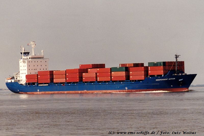 ms INDEPENDENT ACTION auf der Westerschelde auf dem Weg nach Antwerpen im August 2001. Das Schiff kann 1388 TEU stauen und gehört zum Typ "CS 1400". | ![]() | |