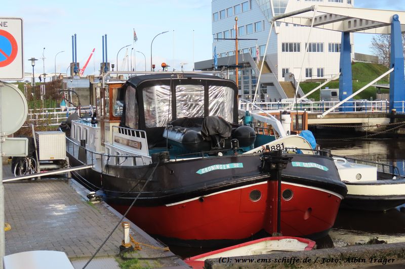 Die ehemalige Motortjalk RES NOVA am 23.11.2023 in Delfzijl. Leider ist nur wenig bekannt zu diesem Schiff. Ende der 70`er Jahre erfolgte der Umbau zum fahrenden Wohnschiff, der Eigner lebte bis zu seinem Tod 2008 auf dem Schiff.