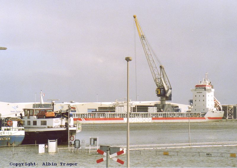 ms EGBERT WAGENBORG am 09.November 2007 in Delfzijl während der Hafenüberflutung. | ![]() | |
