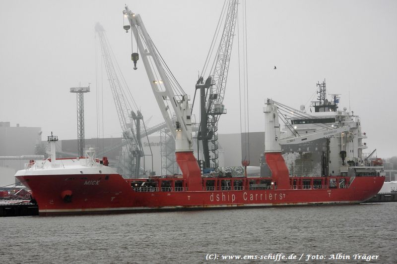 ms MICK am 16.Februar 2026 in Emden. Das Schiff verfügt über 2 Kräne á 250 t. | ![]() | |
