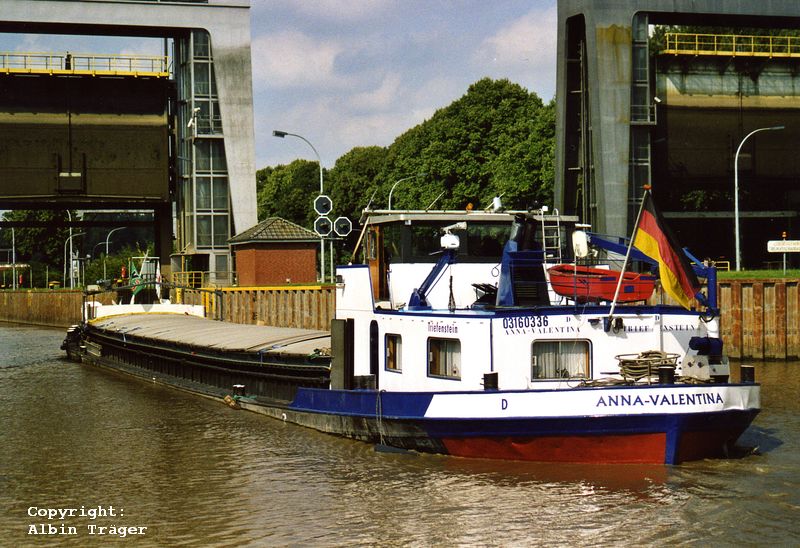 ms ANNA-VALENTINA einlaufend Schleuse Herbrum im August 2008 (1) bzw. auf dem Eemskanaal bei Farmsum (2) | ![]() | |