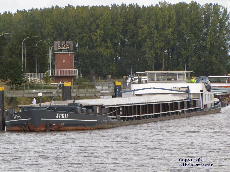 ms ÄPRIL am 17.Oktober 2009 vor der Schleuse Herbrum, sowie auslaufend Schleuse Herbrum im Mai 2010 mit Torf beladen. | ![]() | |