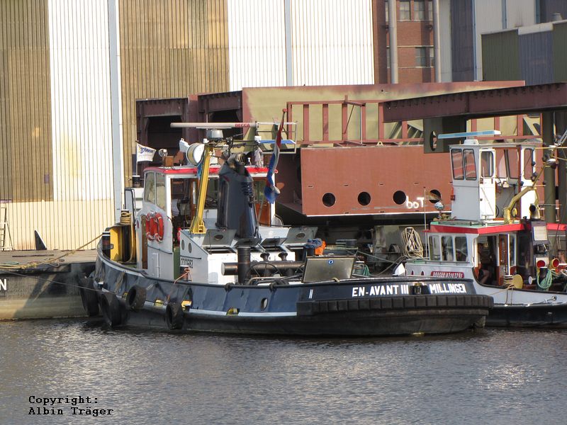 Das Schubboot ms EN AVANT III an der Pier der Scheepswerf "De Hoop" in Foxhol. | ![]() | |