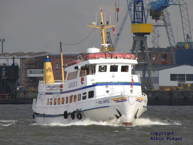 ms ADLER X ein ehemaliges "Butterschiff " ist nun zum Binnenschiff umklassifiziert und macht Hafenrundfahrten im Hamburger Hafen. Das Schiff kann 275 Passagiere befördern. | ![]() | |