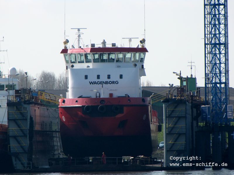 ms SANABORG der Reederei Wagenborg Offshore in der Endausrüstung im Dock der KNSD. Das Schiff hat einen Pfahlzug von 34 t. | ![]() | |