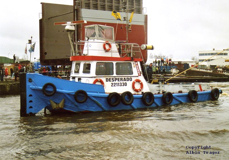 Der Motorschlepper DESPERADO am 19 Januar beim Stapellauf des ms FLINTERFORTUNE und im Februar 2006 in Groningen | ![]() | |