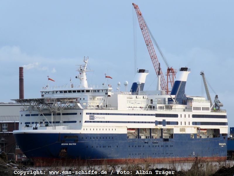 Die 2012 aus einer Fähre zum Offshore Accommodation Support Ship umgebaute REGINA BALTICA am 13.Januar 2017 in Emden. | ![]() | |
