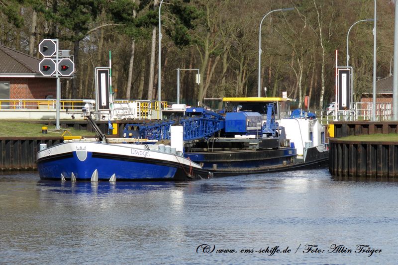 Das Motorkranschiff IJSVOGEL auslaufend Schleuse Bollingerfähr (1) bzw. in Herbrum (2) | ![]() | |