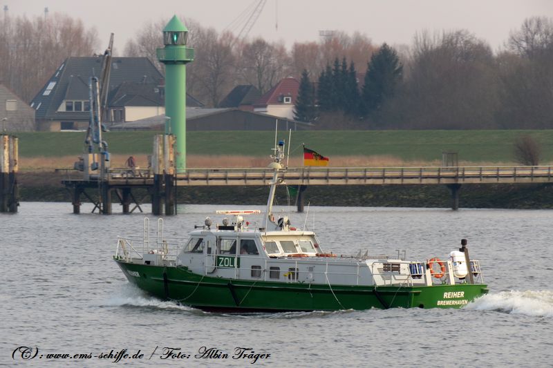 Das Zollboot ms REIHER der 17m-Klasse auf der Weser Richtung Bremen bei Oslebshausen. | ![]() | |