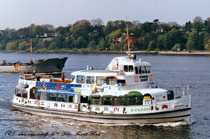 Die HADAG-Hafenfähre NIENDORF in Sonderlackierung auf der Elbe am Bubendeyufer. Das Schiff gehört zum Typ IIIc der HADAG konnte 600 Passagiere befördern. Verbleib: 2001 GREVELINGEN (02325173) -> 2013 TRAFARIA PRAIA in Porto