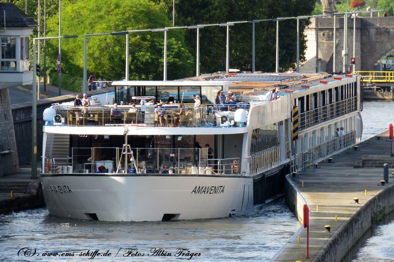 Das Kreuzfahrtschiff ms AMAVENITA passiert Würzburg mainaufwärts. Das Schiff kann 164 Passagiere in 82 Kabinen befördern. | ![]() | |