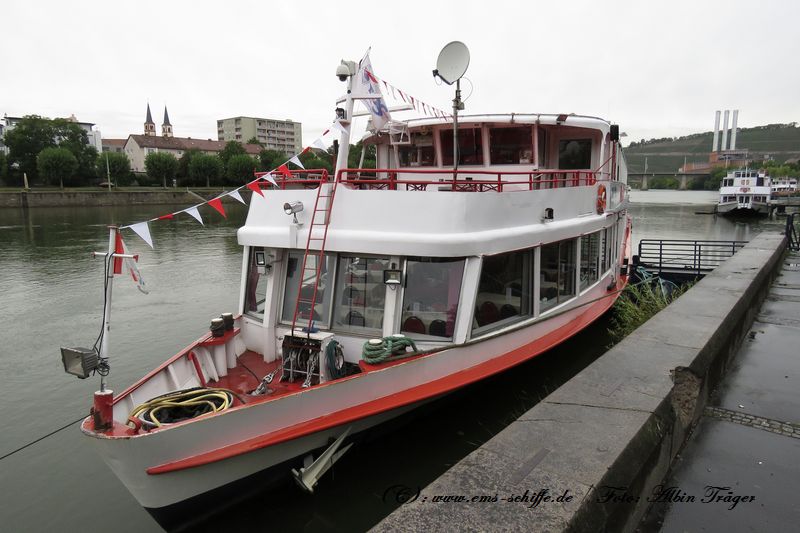 fgs FRANCONIA auf Main in Würzburg. Das Schiff kann 600 Passagiere befördern und hat eine Sonderzulassung für Mehrtagesfahrten nach Aufstellung von Kabinentrennwänden. | ![]() | |