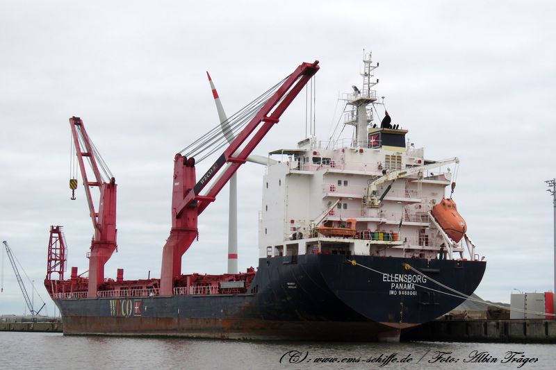 ms ELLENSBORG liegt am Emdener Südkai 09/2019. Das Schiff kann 665 TEU stauen und verfügt über 2 Kräne á 150 t. | ![]() | |