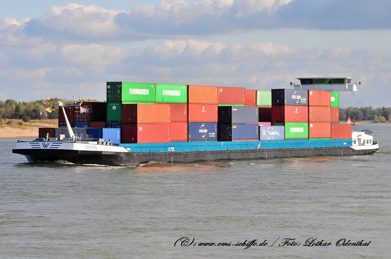 gms CRIGEE passiert Xanten zu Tal. Das kann 421 TEU stauen. | ![]() | |